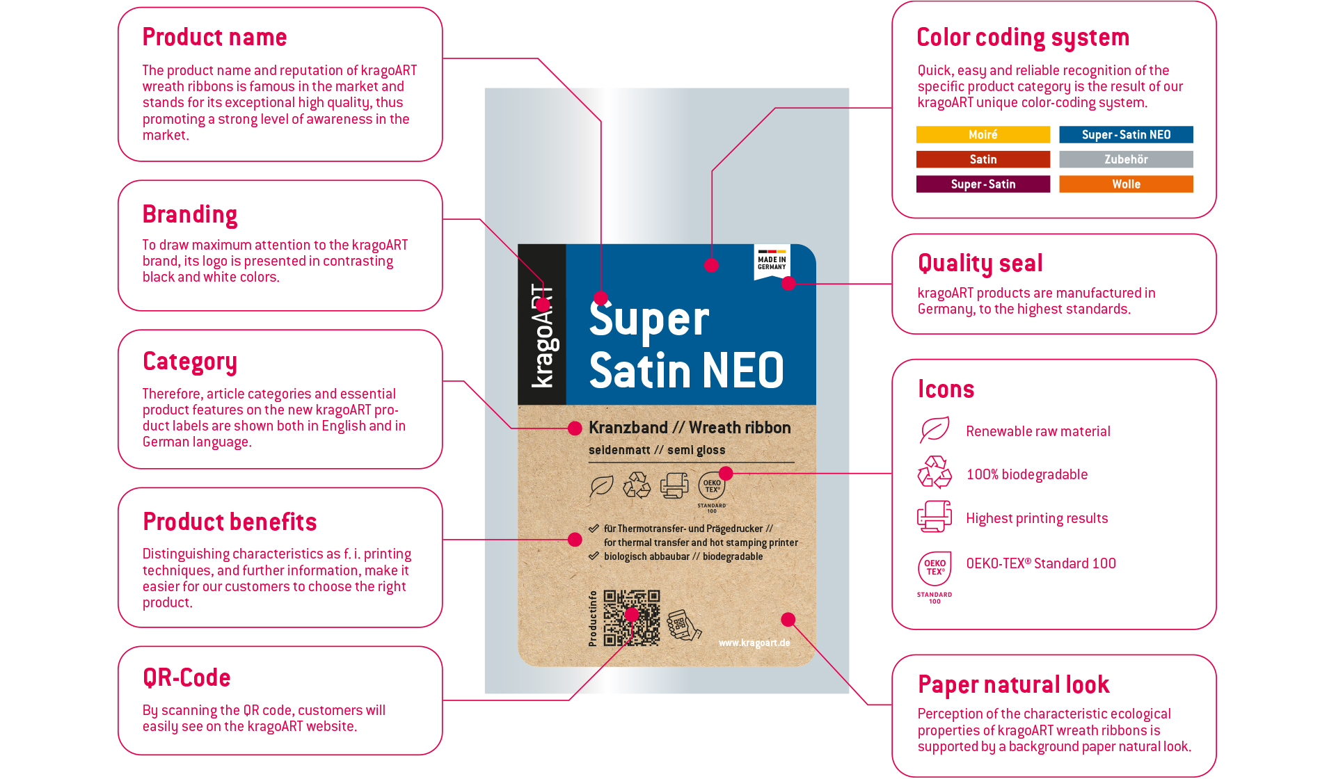 The QR code can be scanned by the customer with a smartphone in the store and leads to further information on the kragoART website, such as Printing instructions and recommended printers to achieve optimal printing results for you. Here you will find an overview of the labelling and printing techniques for which our wreath ribbons are best suited: www.kragoart.de/en/printing-instructions