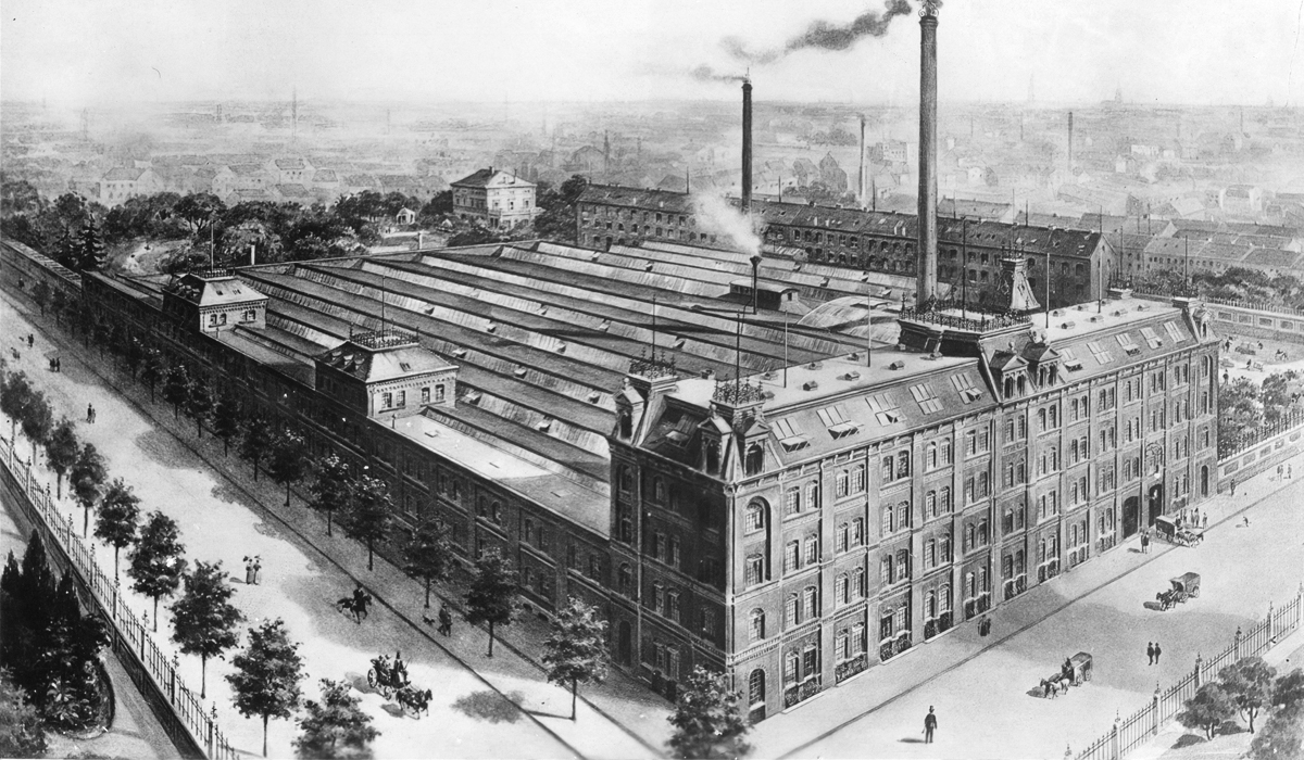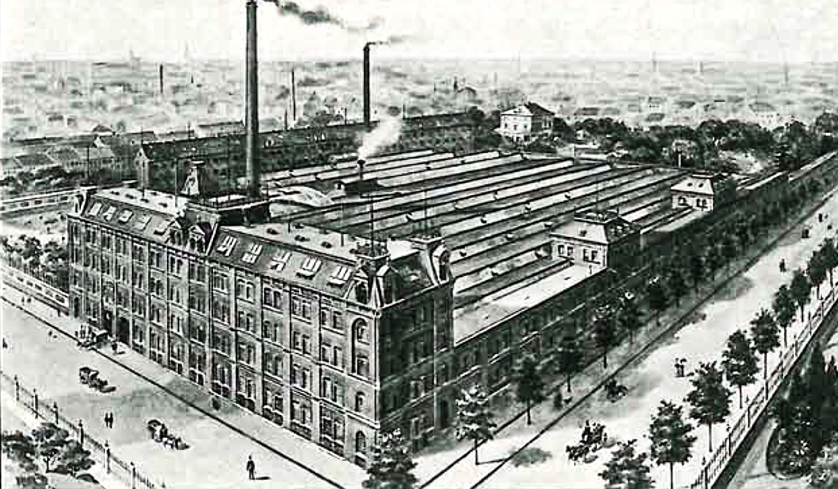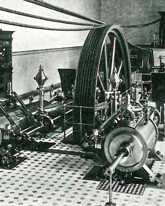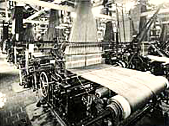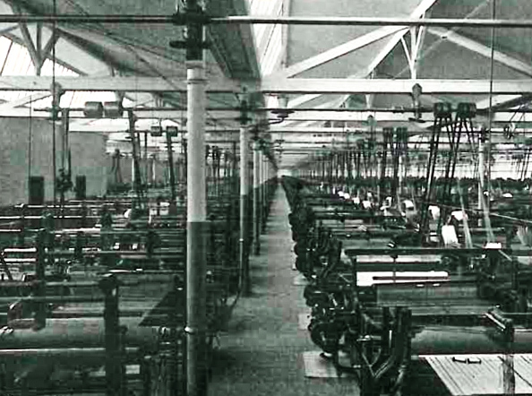 Aufstellung der ersten mechanischen Webstühle am Niederrhein. Damals ein kühnes Unternehmen, da mechanische Webstühle als absolute Innovation galten und bei weitem noch nicht voll entwickelt waren. Der Haupttransmissionsriemen lief damals von der Antriebswelle der Dampfmaschine hinab in das Kellergewölbe. Von hier aus wurden über Umlenkwalzen die Webmaschinen im Erdgeschoss einzeln gesteuert.