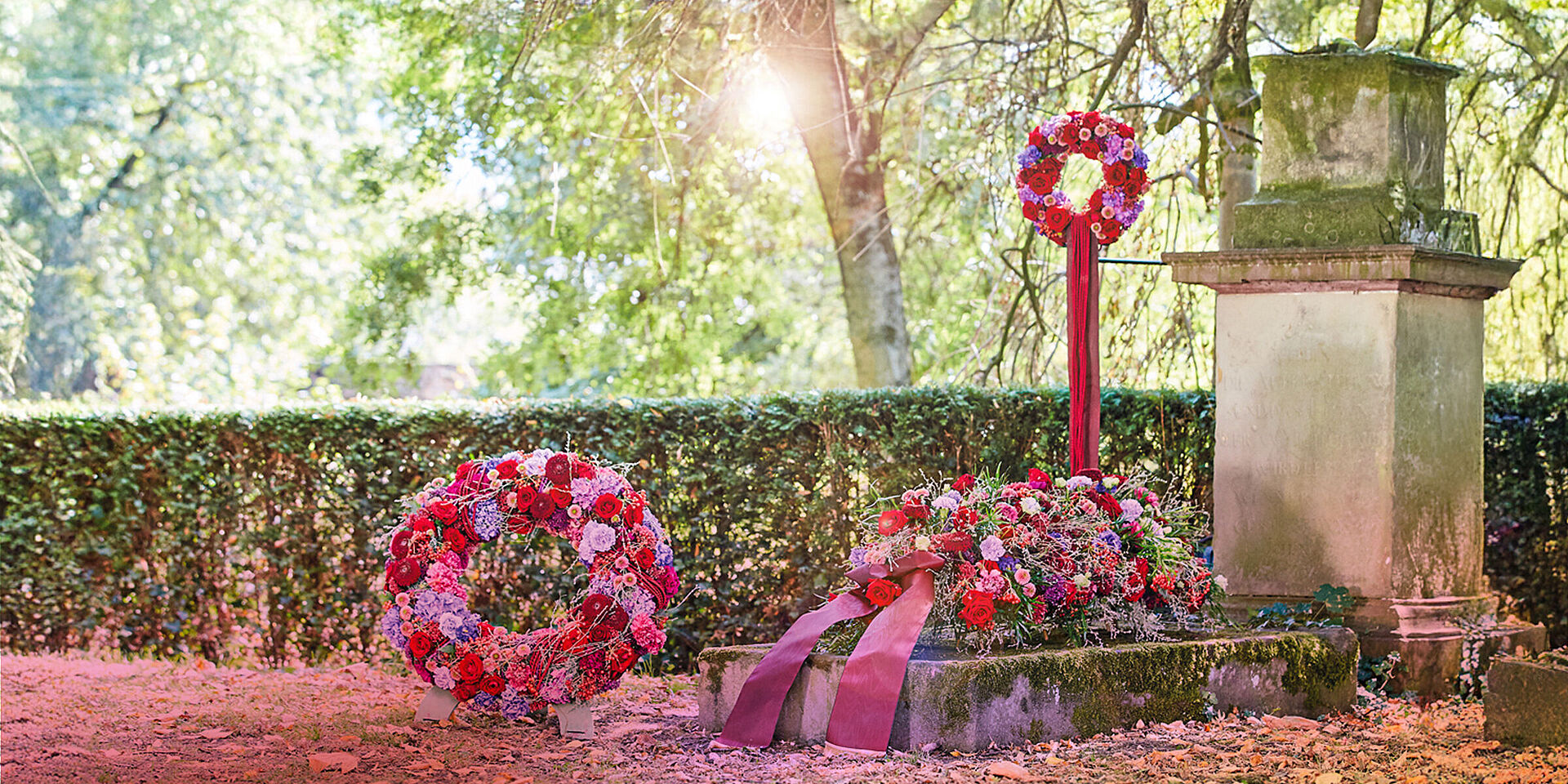 Bei Trauerfällen hat die Trauerfloristik eine große Bedeutung, hierbei zieren Kranzbänder sowohl in Trauerfarben als auch in helleren Farben Gestecke und Trauerkränze. Der Schleifendruck macht es möglich, noch eine letzte Botschaft mit auf den Weg zu geben, dabei sind für die Gestaltung von Grabschleifen keine Grenzen gesetzt.