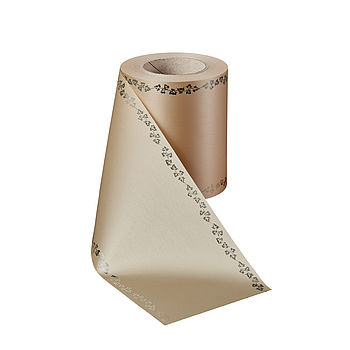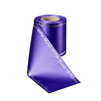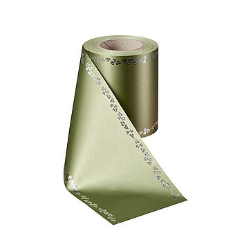 Kranzband Super-Satin mit Rand Efeu Silber - Art. 06737Das Dekor aus silbernen Efeu-Blättern ist ein pietätvolles Muster auf allen Kranzbändern - es harmoniert sehr gut mit floralen Arrangements.